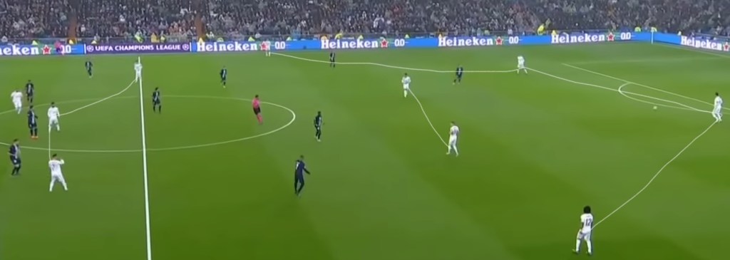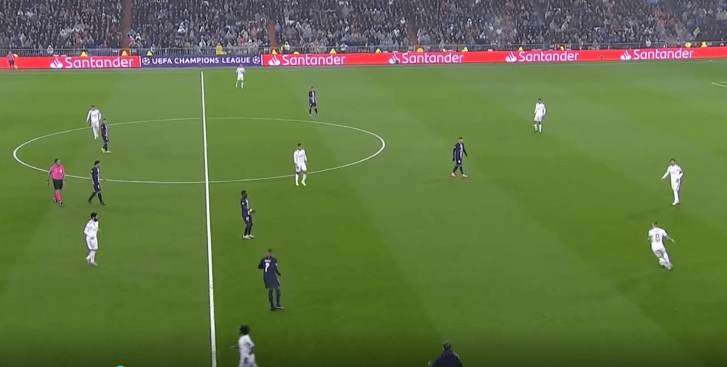 Real Madrid played a very high defensive line and were pressing PSG very high up the pitch. This made them vulnerable to PSG’s counterattack. But unlike the last time round when the two teams met, Los Blancos did not leave huge gaps between midfield and defense. So they were easily able to recover the ball back much once they lose possession.