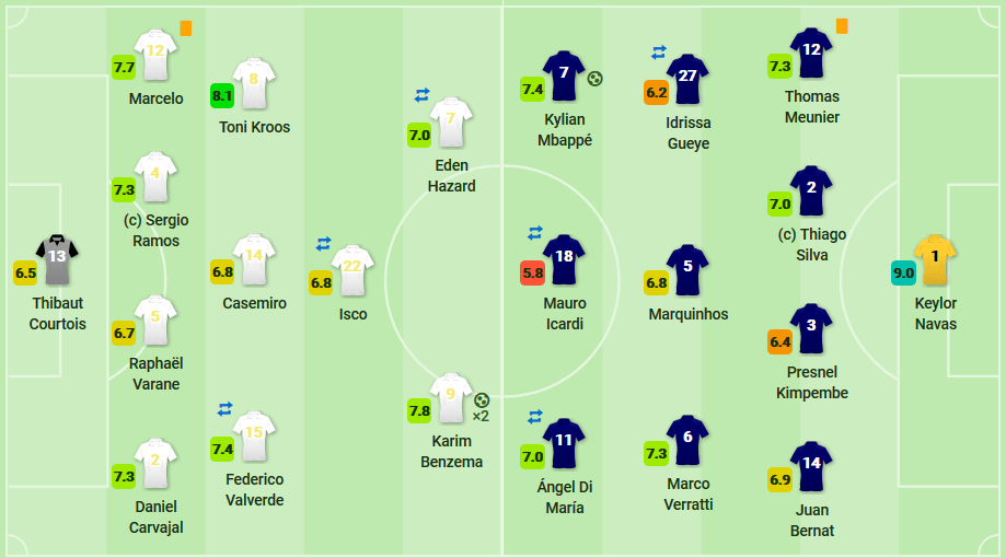 - Eden Hazard showed more of his Chelsea form as he was a threat whenever he had the ball. Infact his amazing dribble past the midfield of PSG led to the build up of what was an amazing first goal for Real Madrid